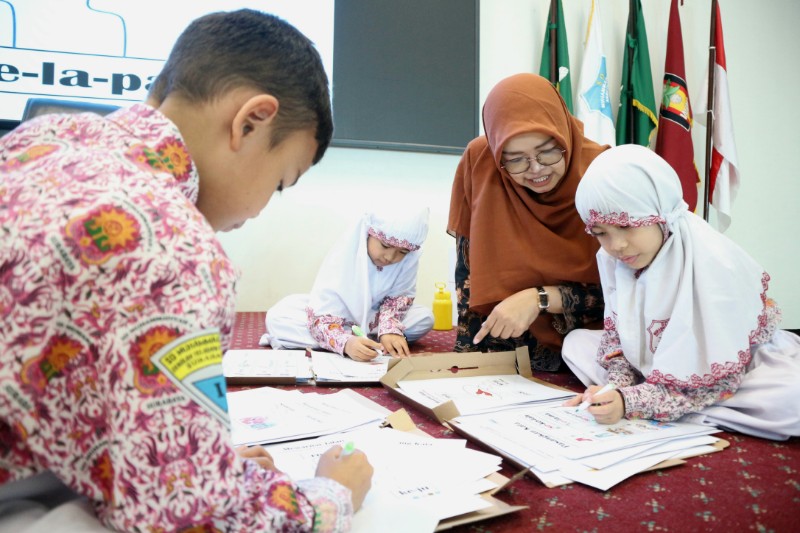 Murid SD Muhammadiyah 4 (Mudipat) antusias mengikuti proses belajar menggunakan alat peraga dan permainan pada Rabu (8/10) di Gedung TMB Mudipat Pucang Surabaya.