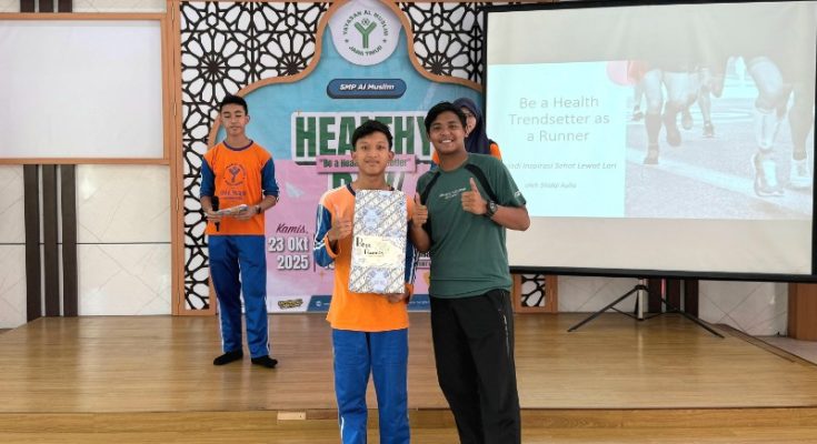Siswa SMP Al Muslim turut serta dalam kegiatan Healthy Day yang digelar di lingkungan sekolah, Kamis, 23 Oktober 2025. Kegiatan yang mengusung tema “Be a Health Trendsetter” ini dirancang untuk menumbuhkan kesadaran akan pentingnya gaya hidup sehat secara holistik meliputi aspek fisik, mental, dan sosial sejak dini.