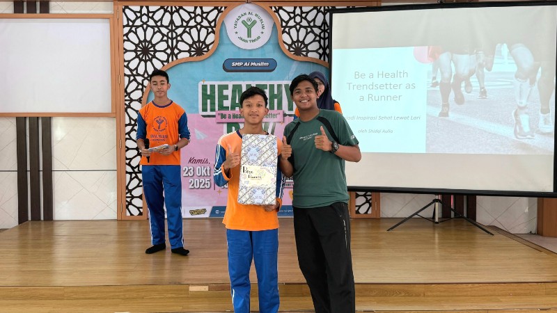 Siswa SMP Al Muslim turut serta dalam kegiatan Healthy Day yang digelar di lingkungan sekolah, Kamis, 23 Oktober 2025. Kegiatan yang mengusung tema “Be a Health Trendsetter” ini dirancang untuk menumbuhkan kesadaran akan pentingnya gaya hidup sehat secara holistik meliputi aspek fisik, mental, dan sosial sejak dini.