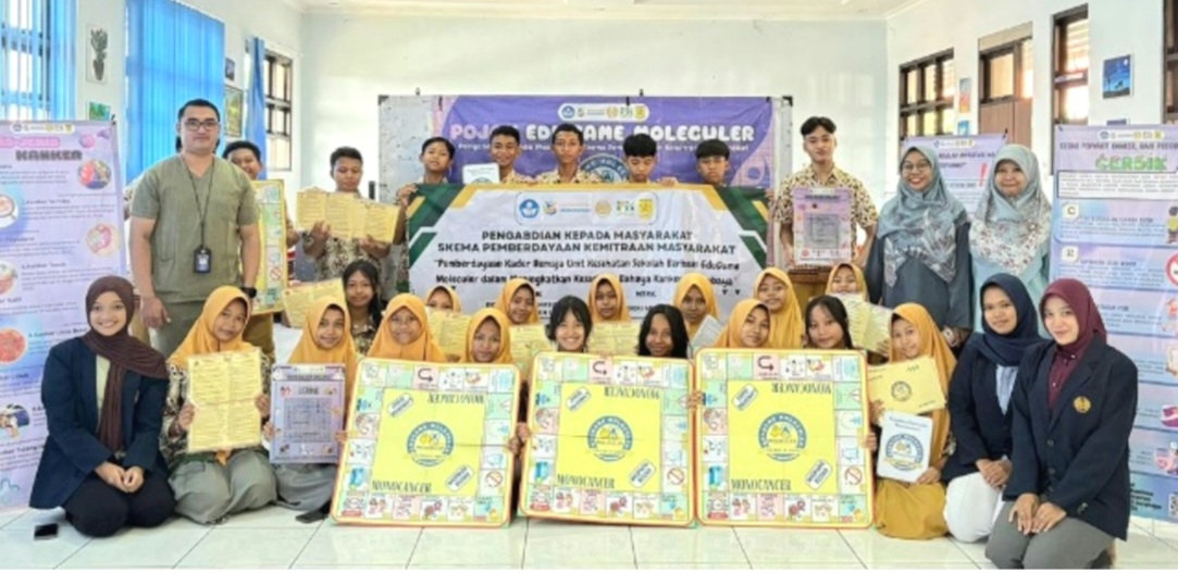 PKM ini berjudul “Pemberdayaan Kader Remaja Unit Kesehatan Sekolah (UKS) Berbasis EduGame Moleculer dalam Meningkatkan Kesadaran Bahaya Kanker di Surabaya.” Kegiatan ini diselenggarakan di SMP Negeri 40 Surabaya dan SMP IT Ustman Bin Affan Surabaya pada bulan Juni – Oktober 2025, dengan melibatkan para kader remaja UKS sebagai agen edukasi kesehatan berbasis permainan edukatif terdiri monocancer, word puzzle, flash card edukatif.