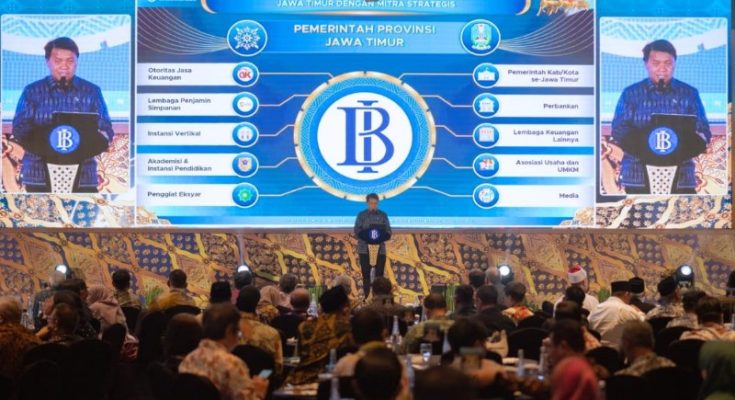 Kantor Perwakilan Bank Indonesia Provinsi Jawa Timur bersama pemerintah daerah mendorong percepatan ekonomi melalui High Level Meeting pimpinan daerah, promosi investasi, penguatan kapasitas proyek, dan digitalisasi pembayaran, dengan enam fokus kolaborasi PTBI Jatim 2025: akselerasi investasi daerah, penguatan industri, penguatan UMKM, optimalisasi keuangan daerah, digitalisasi sistem pembayaran, dan pengendalian infiasi sebagai upaya mevvujudkan Jawa Timur sebagai Gerbang Baru Nusantara.