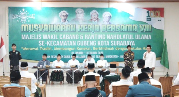 MOJOKERTO – Majelis Wakil Cabang Nahdlatul Ulama (MWCNU) Kecamatan Gubeng, Kota Surabaya, sukses menyelenggarakan Musyawarah Kerja Bersama (Muskerber) ke-8 pada Sabtu (31/1) di Trawas, Mojokerto. Mengusung tema “Merawat Tradisi, Membangun Koneksi, Berkhidmah Setulus Hati”, agenda ini menjadi momentum penguatan organisasi di tingkat akar rumput.