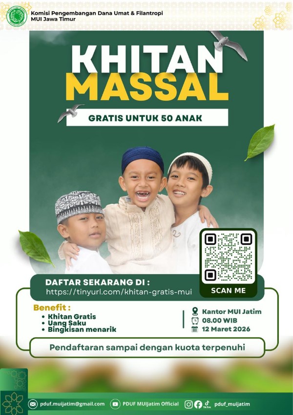 SURABAYA – Komisi Pengembangan Dana Umat & Filantropi (PDUF) Majelis Ulama Indonesia (MUI) Jawa Timur akan menyelenggarakan kegiatan sosial khitan massal secara gratis bagi masyarakat. Program ini ditujukan khusus untuk 50 anak dan direncanakan berlangsung pada bulan Maret mendatang.